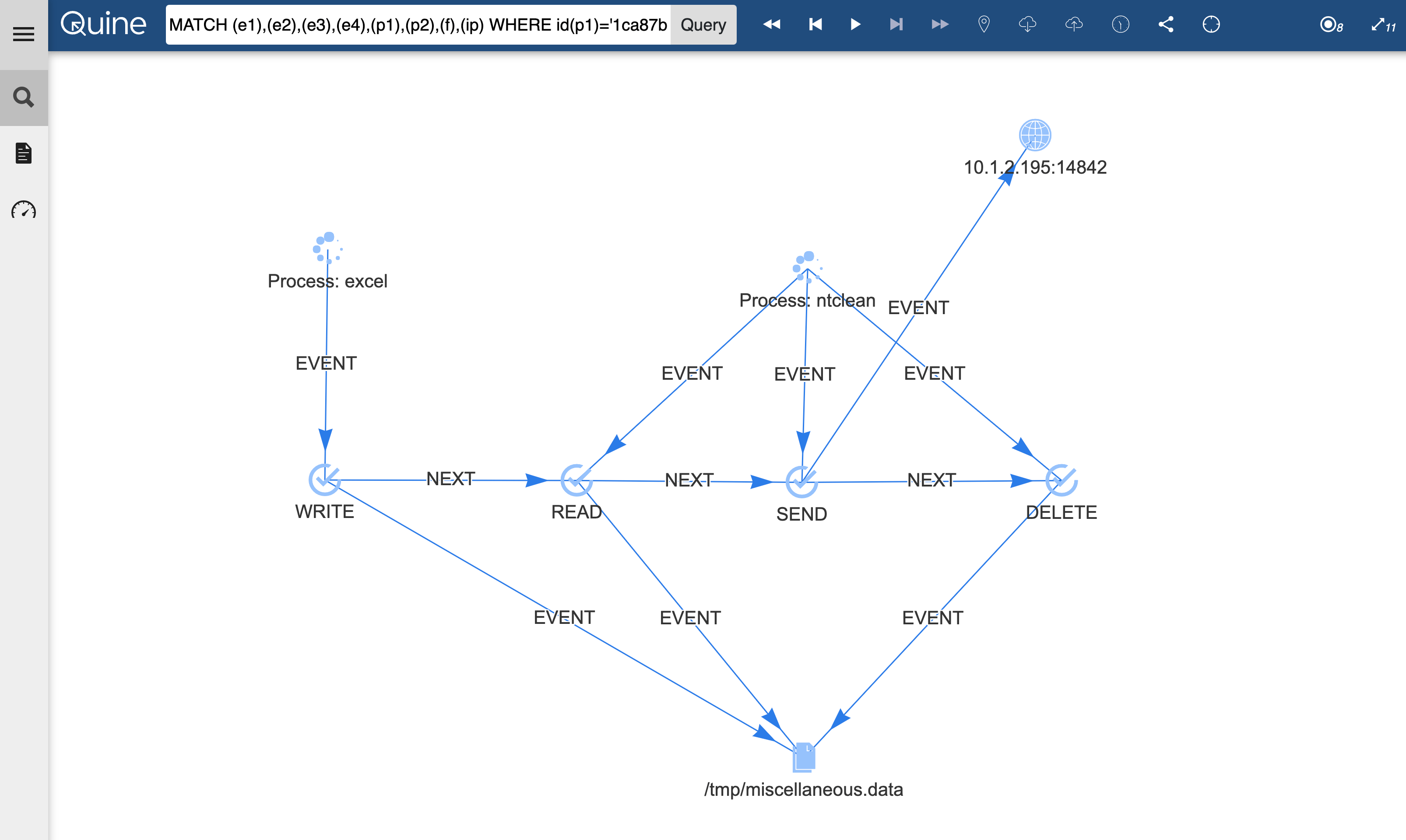 Using a standing query, the recipe monitors for covert interprocess communication using a file to pass data. When that pattern is matched, with a network SEND event, we have our smoking gun and a URL is logged linking to the Quine Exploration UI with the full activity and context for investigation.