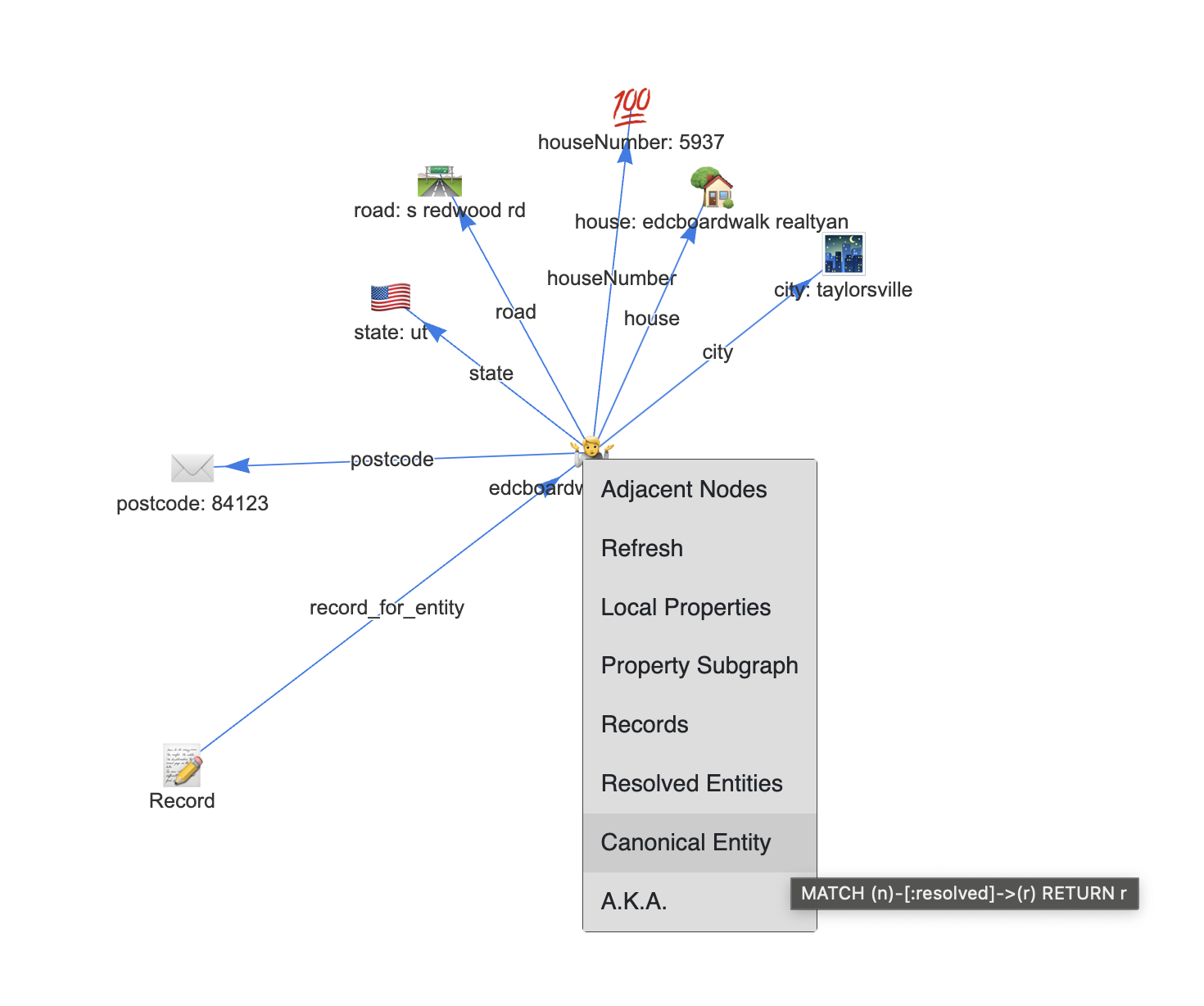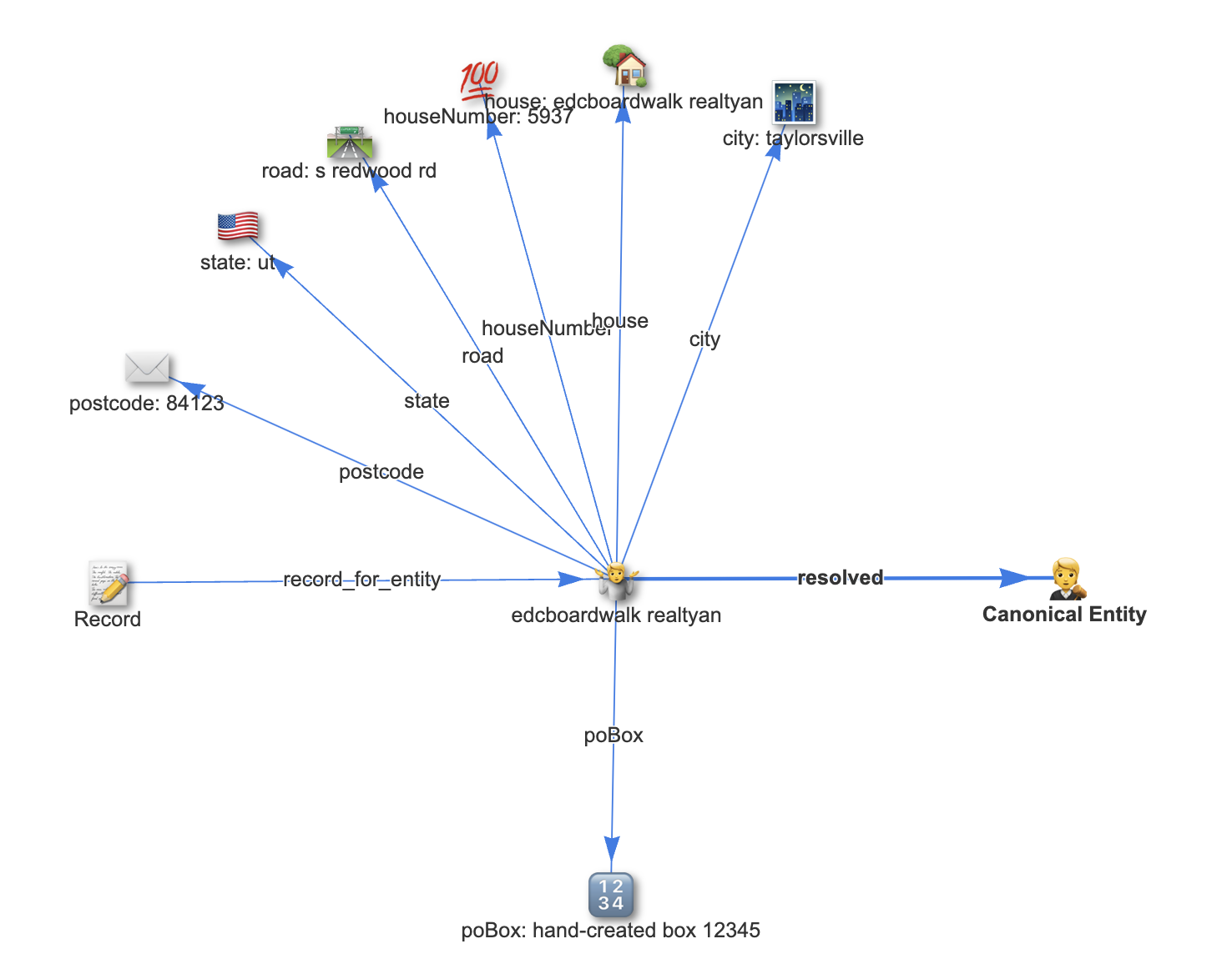 We can verify this by using the third sample query to render the entity node for this specific record, using that entity node's Property Subgraph quick query to show a missing poBox, and using that node's Canonical Entity quick query, which will correctly NOT render anything, since without a poBox, the entity can't resolve to a canonical entity.