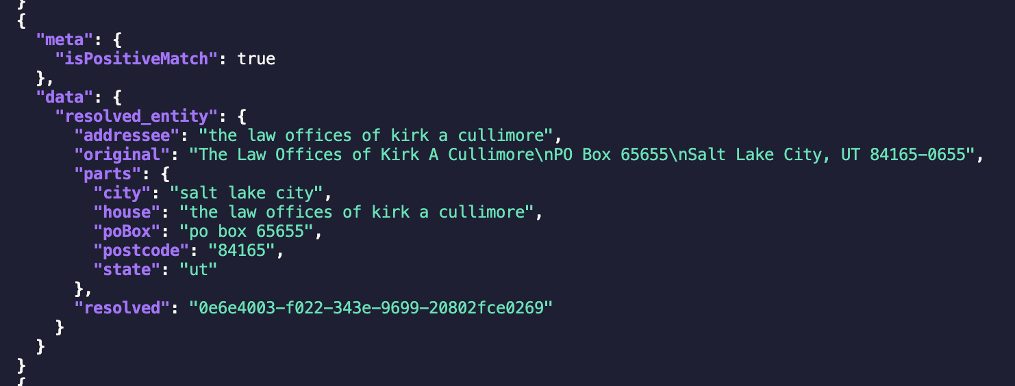 Since this fulfills the standing query for entity resolution for the "edcboardwalk realtyan" entity, the standing query will resolve this entity to a Canonical Entity, which will be immediately streamed out to the output file, and we can view it by issuing that Canonical Entity quick query again.