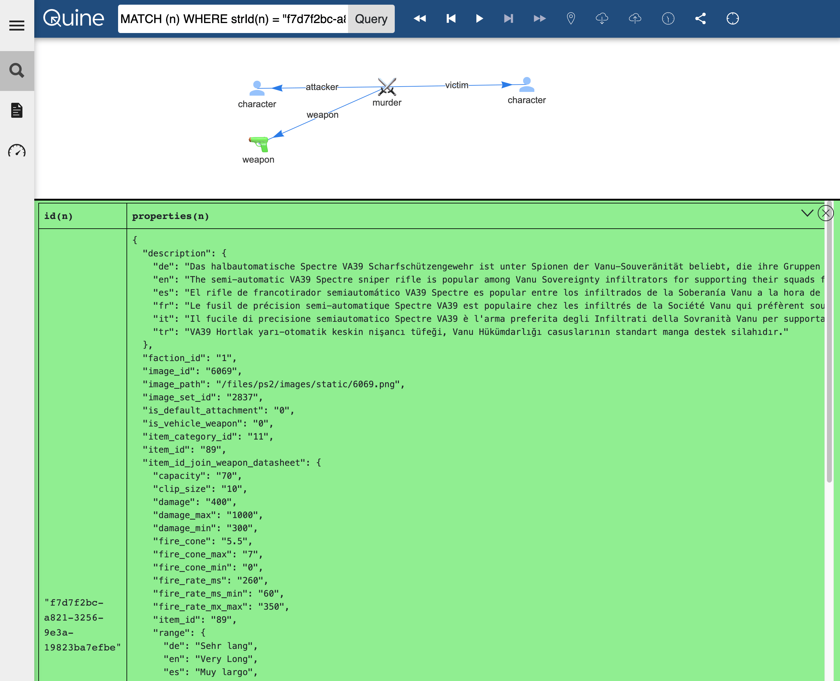 A second standing query matches each new weapon node to populate the weapon properties via the census API.
