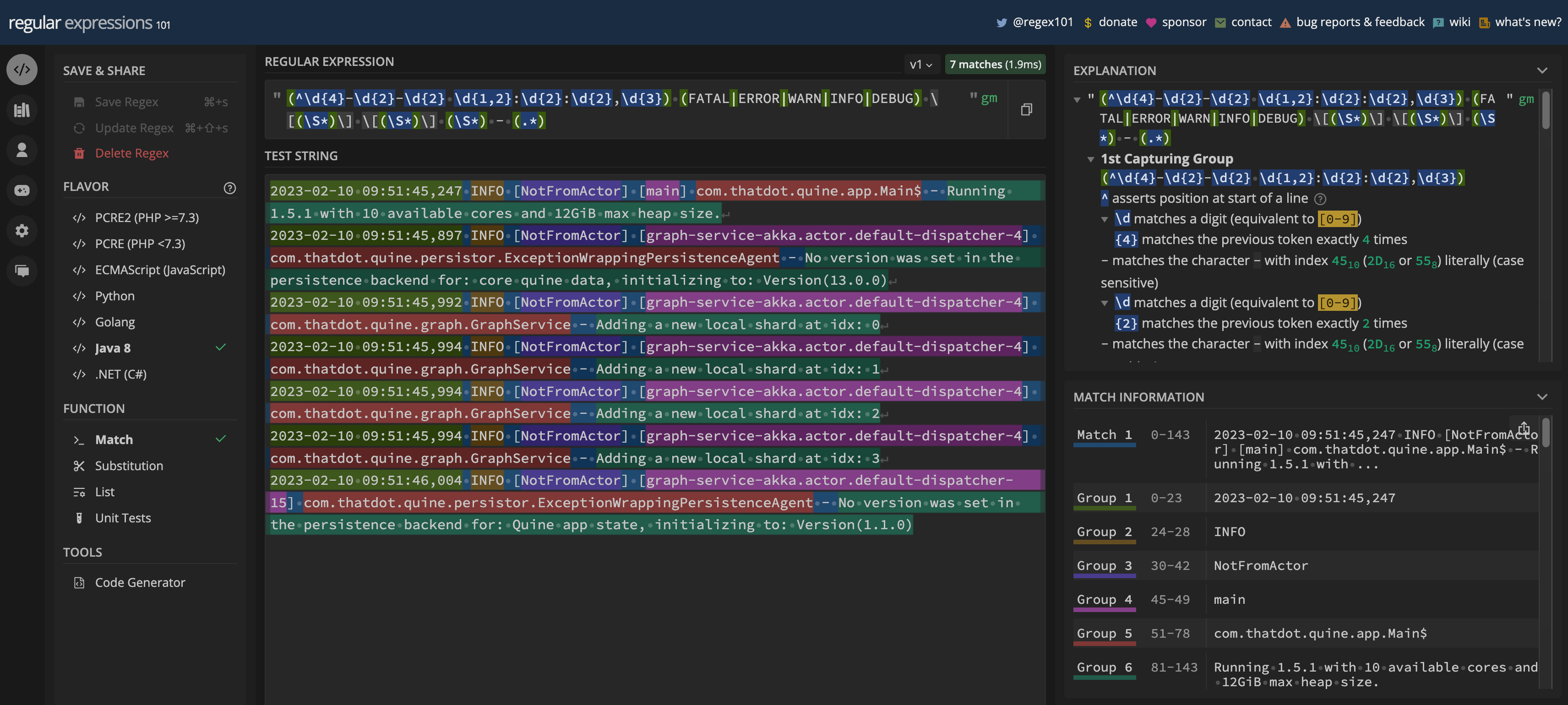 WITH text.regexFirstMatch($that, "(^\\d{4}-\\d{2}-\\d{2} \\d{1,2}:\\d{2}:\\d{2},\\d{3}) (FATAL|ERROR|WARN|INFO|DEBUG) \\[(\\S*)\\] \\[(\\S*)\\] (\\S*) - (.*)") AS r WHERE r IS NOT NULL